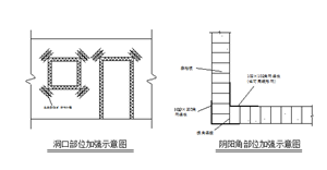 ⑦并在所有陰陽角、門窗洞口板縫處要設加強網(wǎng),陰陽角處用角網(wǎng),門窗洞口用不小于600MM的平網(wǎng)呈45度角放置補強,用扎絲將其綁扎牢固,見下圖: